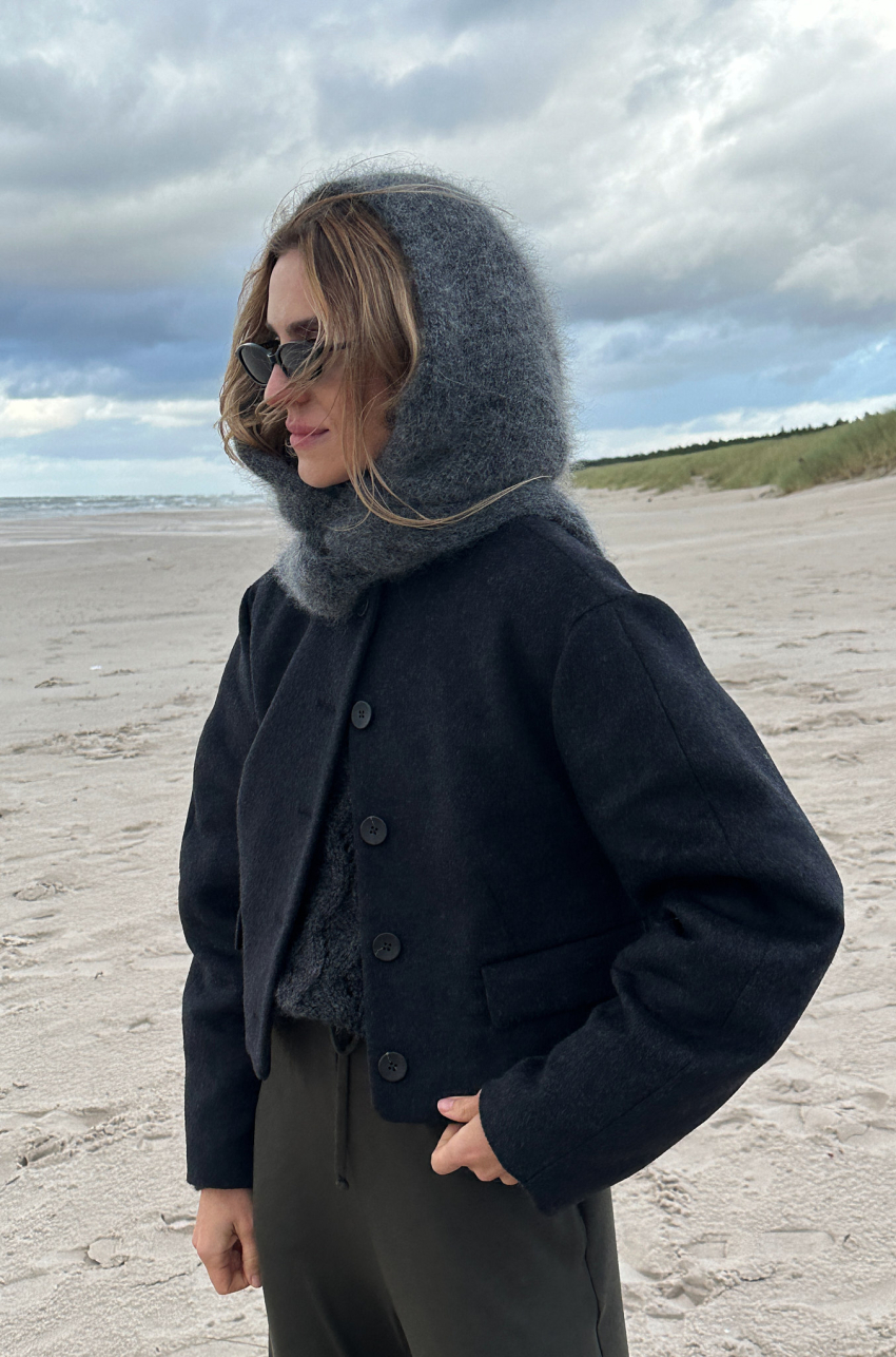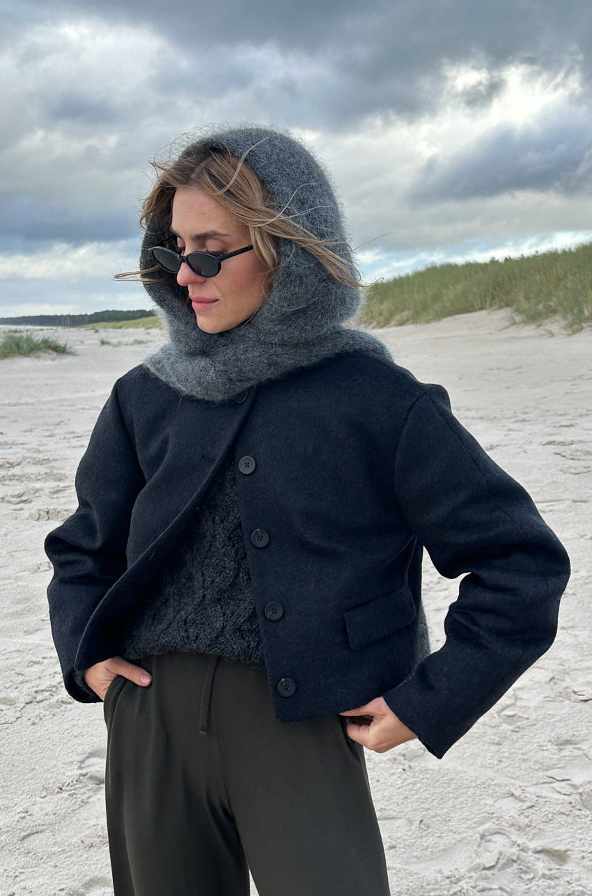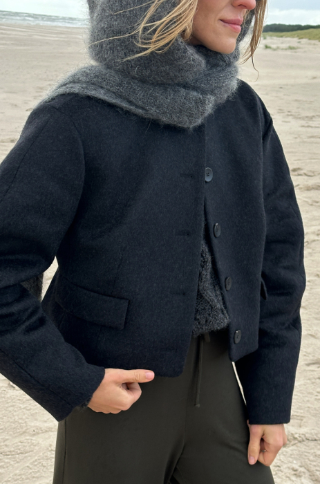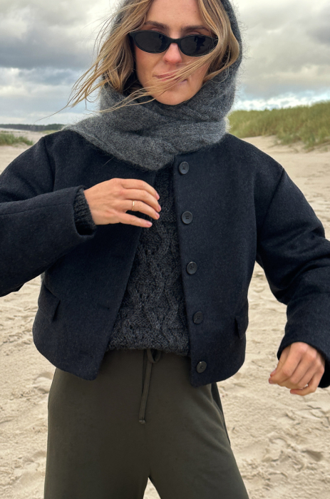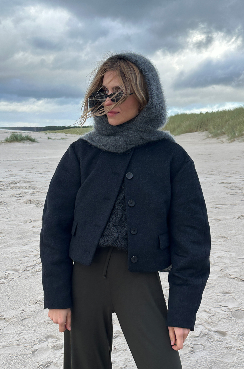 Krótka kurtka w kolorze grafitowym o pudełkowym kroju, która dzięki swojej minimalistycznej formie idealnie dopełnia jesienno-zimową garderobę. Wykonana z mięsistej tkaniny o wyczuwalnej strukturze. Obniżona linia ramion i zaokrąglony kształt rękawa nadają jej nowoczesnego charakteru.