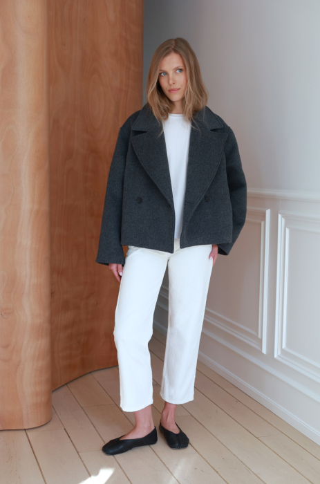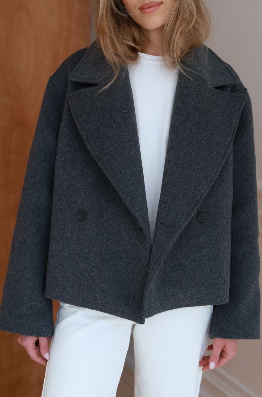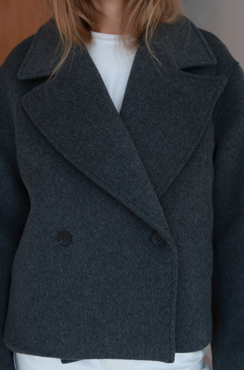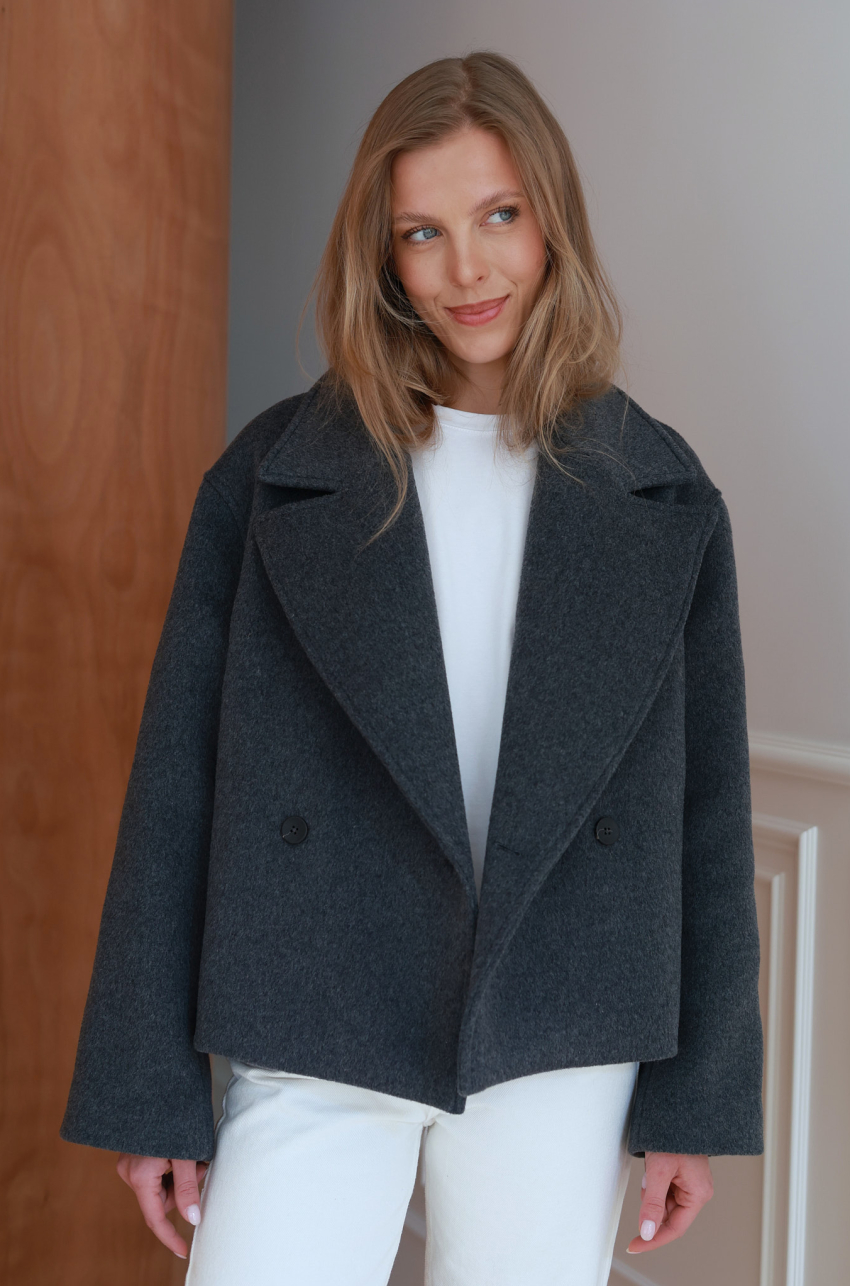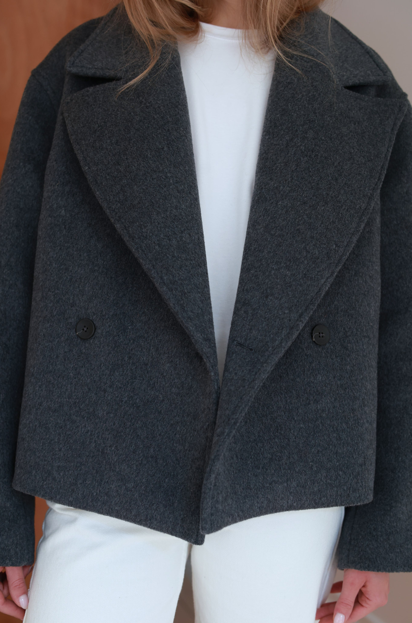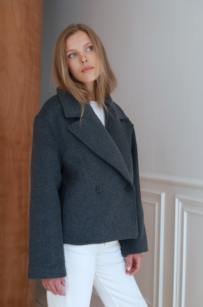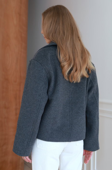 Wełniana kurtka o pudełkowym kroju w odcieniu grafitowej szarości. Uszyta z wysokogatunkowej wełny, która doskonale rozgrzewa, zatrzymując ciepło. Posiada szerokie klapy, dwurzędowe zapięcie i lekko obniżoną linią ramion. Uniwersalna długość sprawia, że doskonale komponuje się zarówno ze spodniami o prostej nogawce, jak i z sukienkami czy spódnicami, stanowiąc ponadczasowy element codziennej garderoby.