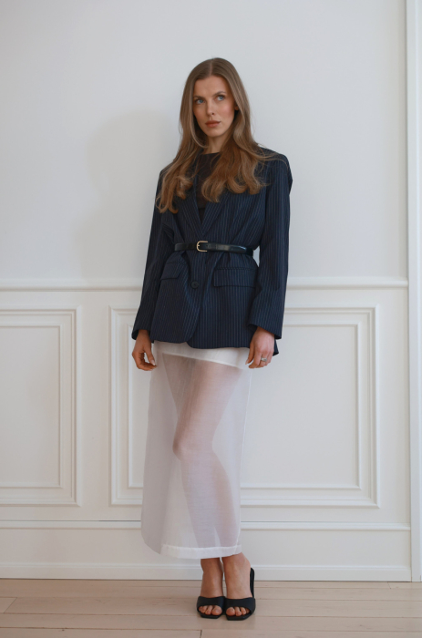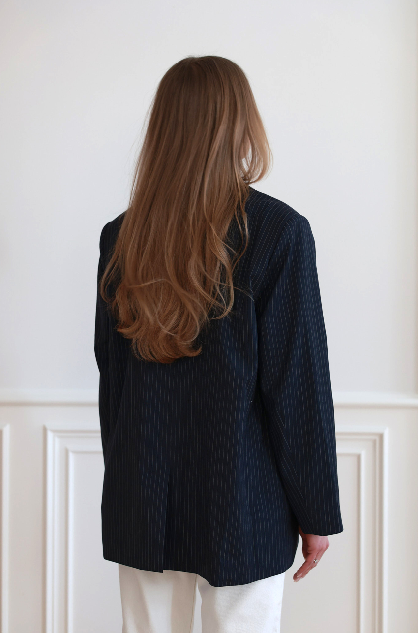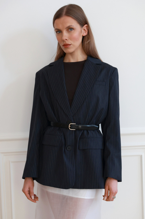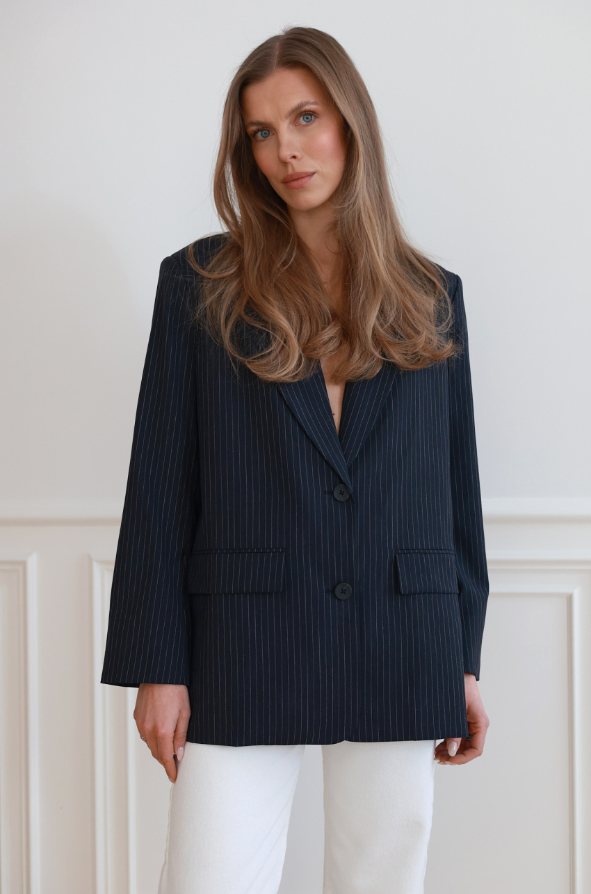 Granatowa marynarka o prostym, lekko oversize’owym kroju. Wykonana z miękkiej tkaniny garniturowej w drobne, pionowe paski. Zapinana na szylkretowe guziki. Z przodu klasyczne klapy i kieszenie z patkami. Posiada podszewkę.