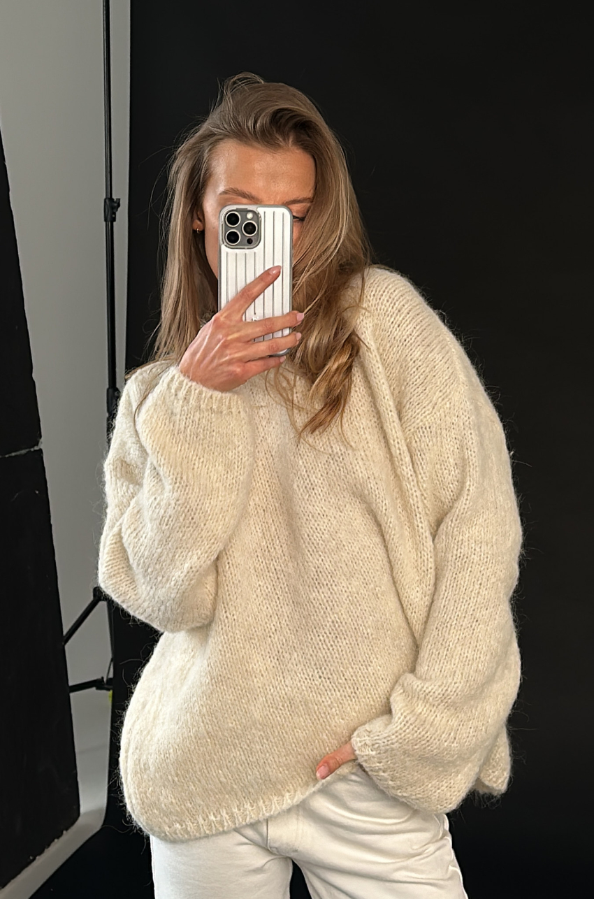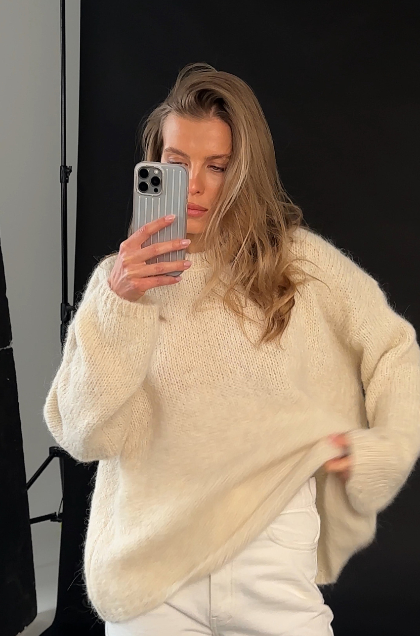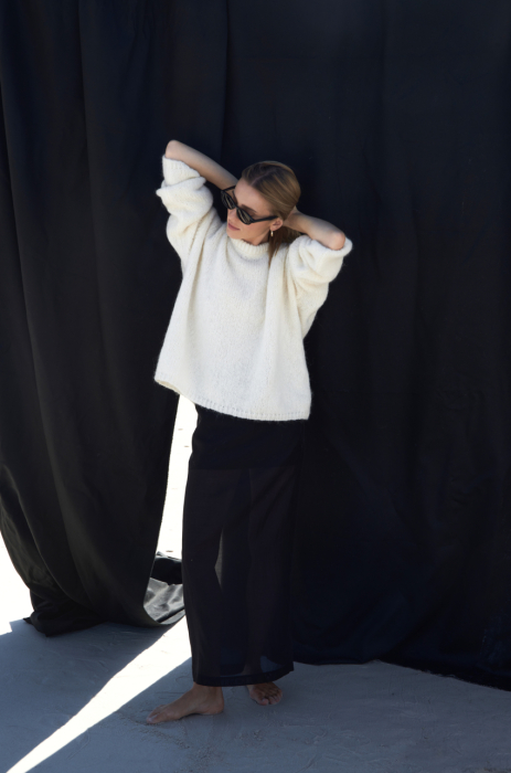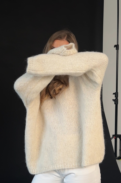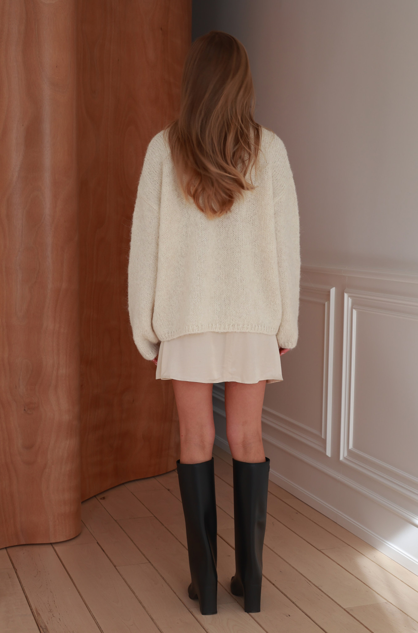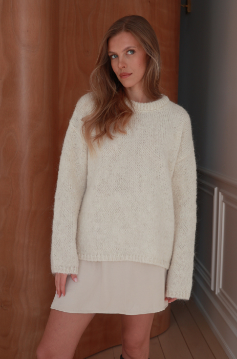 Minimalistyczny sweter w odcieniu ecru, uszyty z przędzy z przewagą wełny. Prosty fason z lekko obniżoną linią ramion oraz wykończony klasycznym ściągaczem przy dekolcie, mankietach i dole. Delikatnie puszysta faktura dzianiny nadaje mu subtelnej lekkości, elegancji i sprawia, że jest idealnym wyborem na chłodniejsze dni.