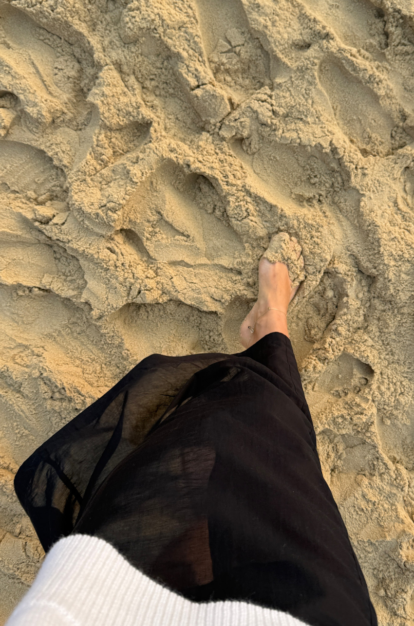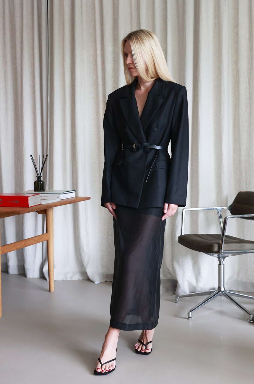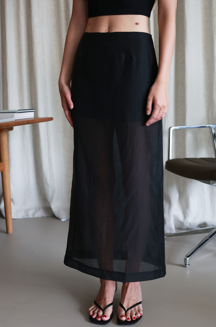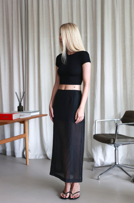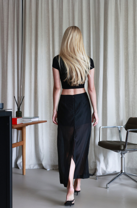 Spódnica maxi o prostym kroju, wykonana z mieszanki lyocellu — włókna znanego ze swojej przewiewności i wyjątkowo delikatnej w dotyku faktury. Lekki, półtransparentny materiał miękko układa się na sylwetce i subtelnie eksponuje nogi. Minimalistyczny charakter modelu sprawia, że świetnie odnajdzie się w codziennych stylizacjach, a w połączeniu z eleganckimi akcesoriami, nabiera bardziej wyrafinowanego charakteru. Z tyłu zapinana na zamek.