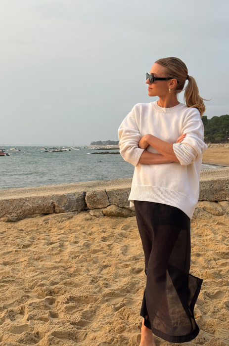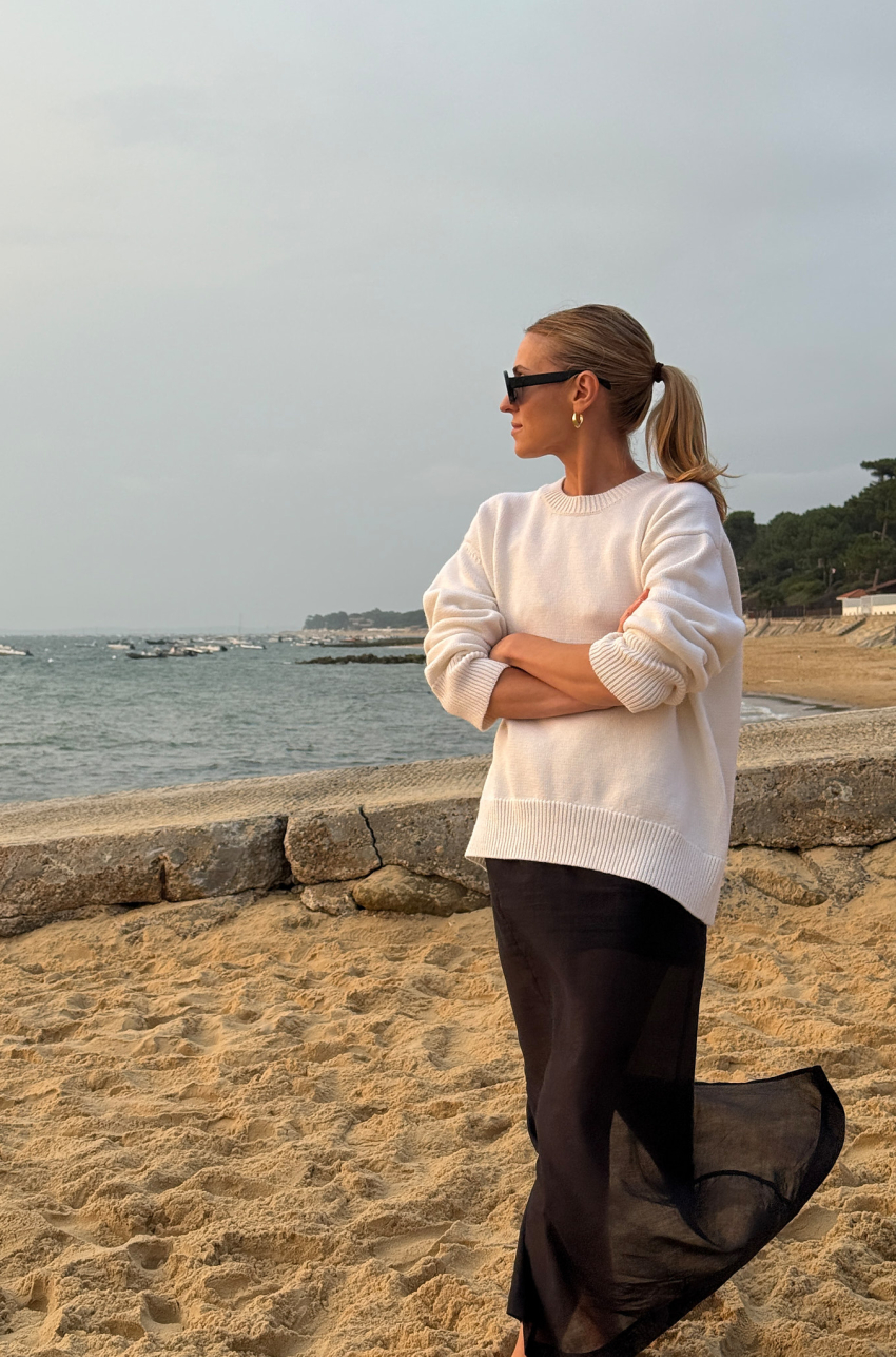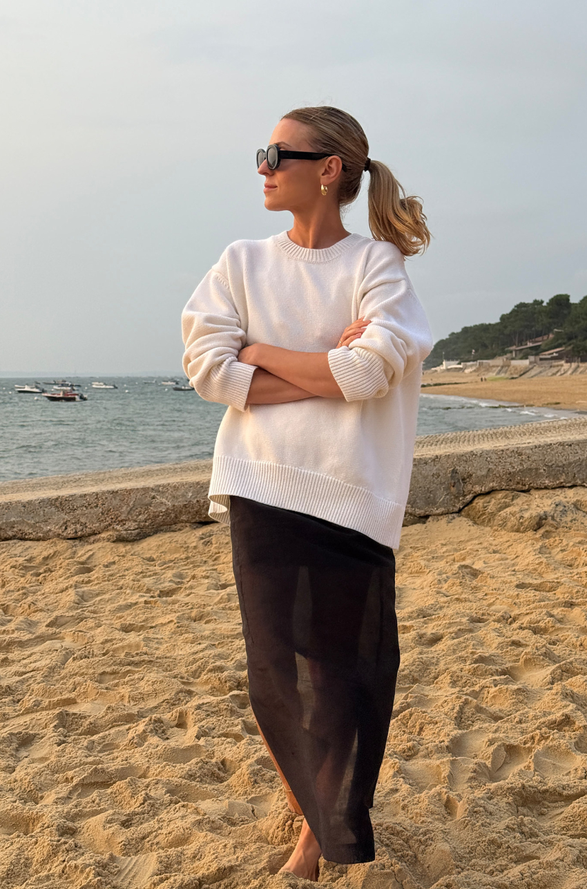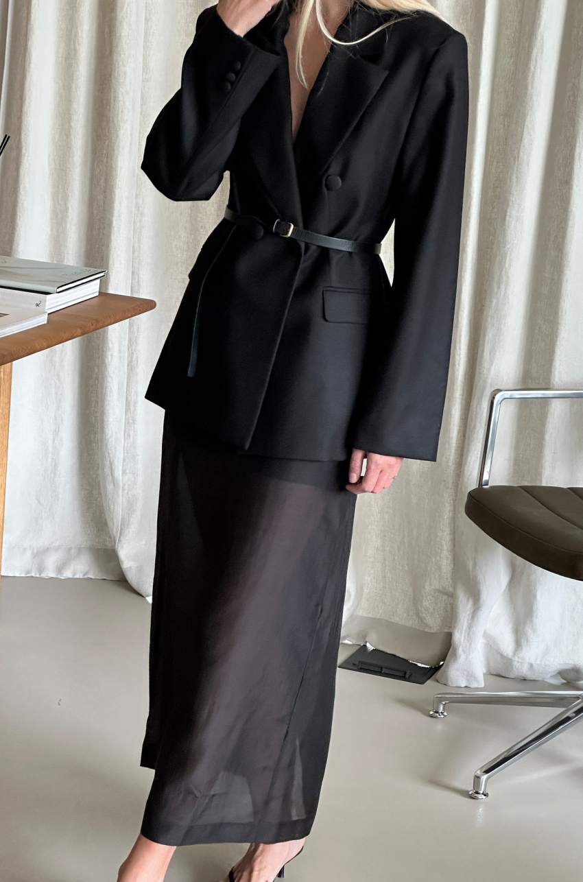 Spódnica maxi o prostym kroju, wykonana z mieszanki lyocellu — włókna znanego ze swojej przewiewności i wyjątkowo delikatnej w dotyku faktury. Lekki, półtransparentny materiał miękko układa się na sylwetce i subtelnie eksponuje nogi. Minimalistyczny charakter modelu sprawia, że świetnie odnajdzie się w codziennych stylizacjach, a w połączeniu z eleganckimi akcesoriami, nabiera bardziej wyrafinowanego charakteru. Z tyłu zapinana na zamek.