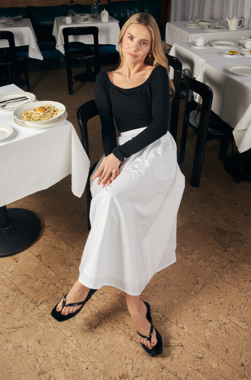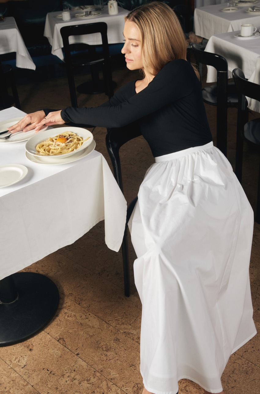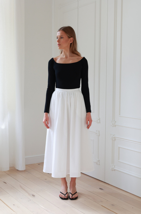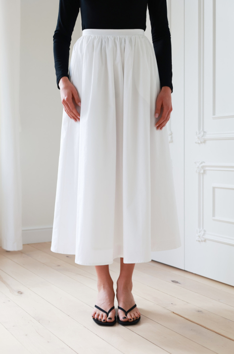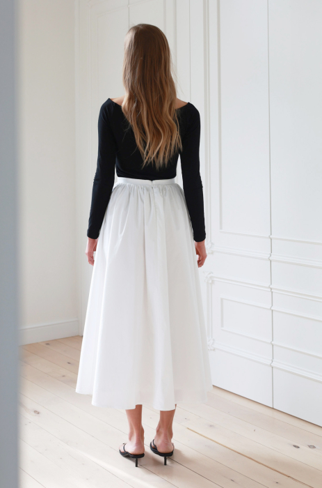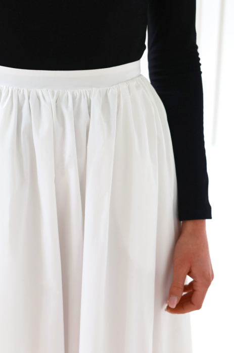 Długa spódnica, wykonana z delikatnej bawełny z certyfikatem Oeko-Tex. Posiada dwie boczne kieszenie oraz marszczenia, które tworzą nowoczesne falbany. Z tyłu dyskretne zapięcie na zamek. Dzięki odpowiedniej gramaturze tkaniny, nie prześwituje i zapewnia pełen komfort użytkowania.
