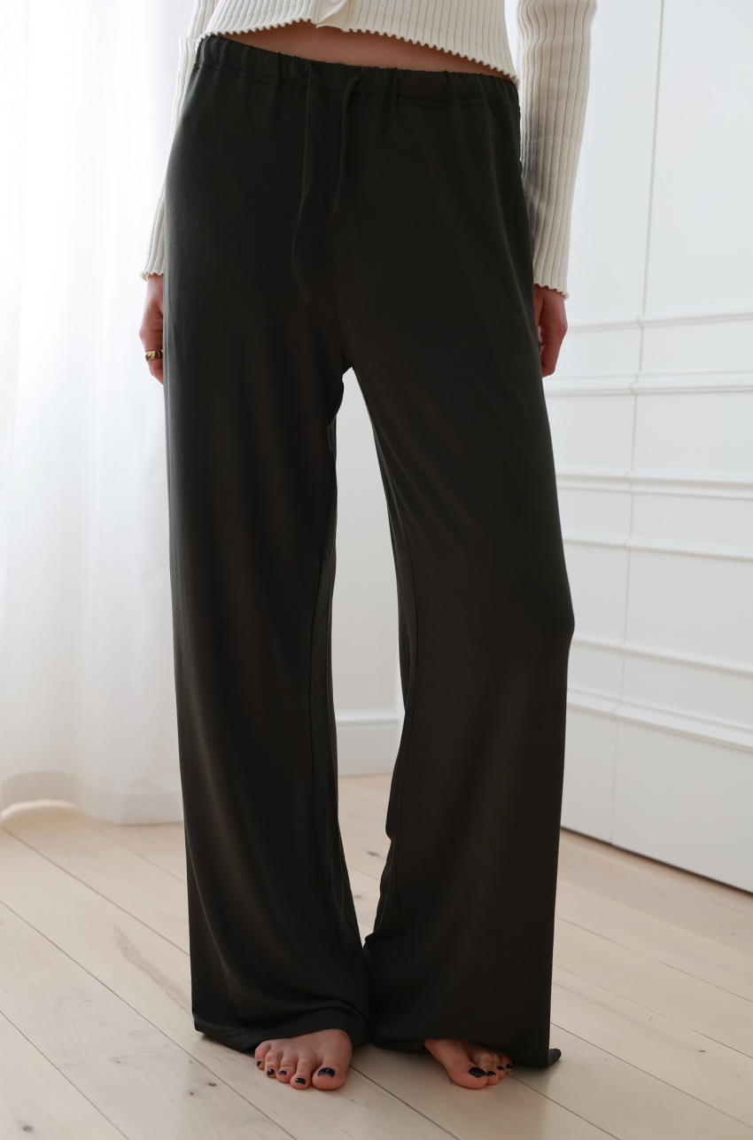 Luźne spodnie dresowe w kolorze khaki, wykonane z przyjemnej dla ciała tkaniny. Posiadają szerokie nogawki, elastyczną talię ze sznurkiem i dyskretne kieszenie w szwach bocznych. To baza, którą możesz stylizować na wiele sposobów.