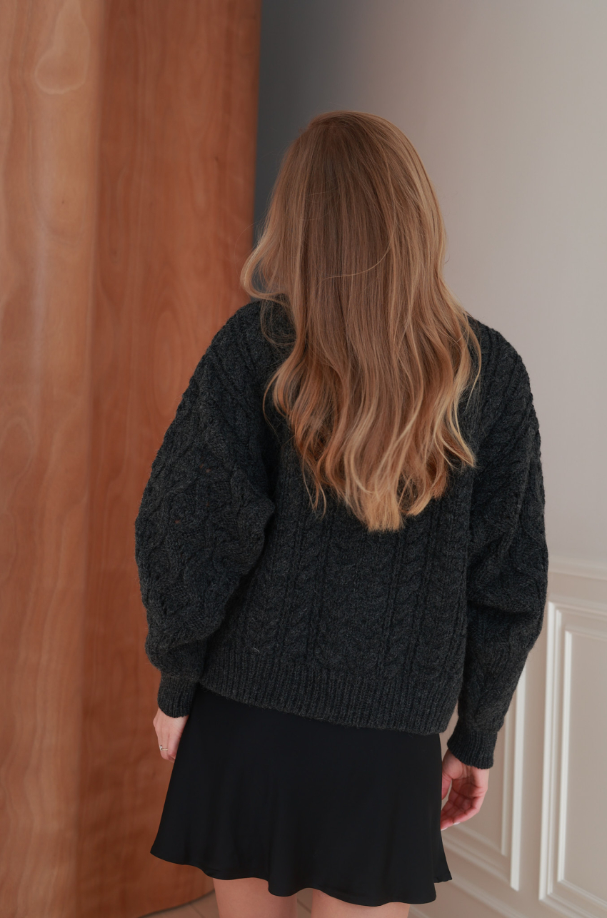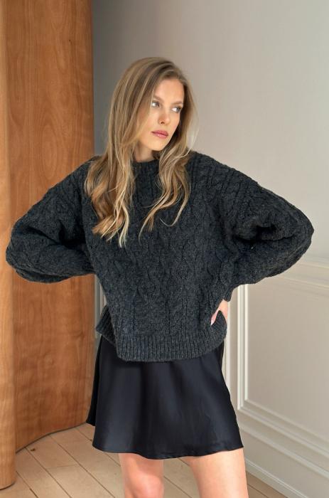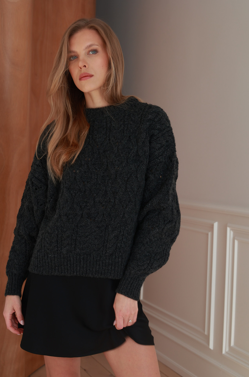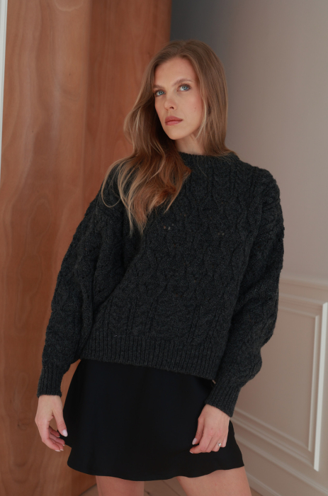 Nasz bestseller powraca w odświeżonej formie. Grafitowy sweter wykonany z mięsistej i przyjemnej w dotyku przędzy z przewagą wełny, o wyraźnym, strukturalnym splocie. Posiada klasyczny, okrągły dekolt oraz ściągacze przy mankietach i u dołu. Rękawy o lekko obniżonej linii.