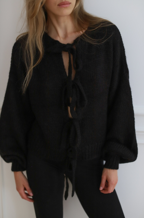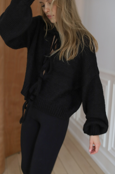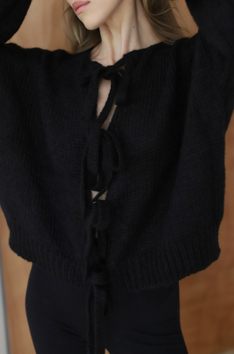 Miękki i puszysty sweter, dziany ze szlachetnej przędzy z przewagą certyfikowanego moheru superkid, który łączy w sobie delikatność moheru i miękkość wełny merynosa. Wiązania na kokardki nadają mu romantycznego charakteru. Model ten posiada nowoczesny fason i wyraźnie obniżoną linię ramion. Rękawy oraz dół zostały wykończone ściągaczem.