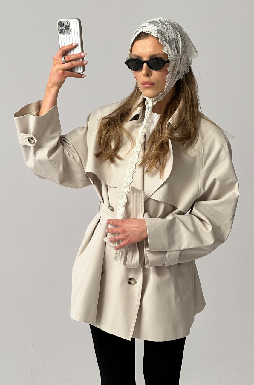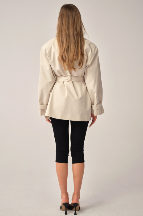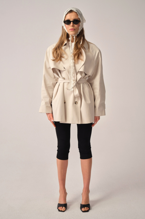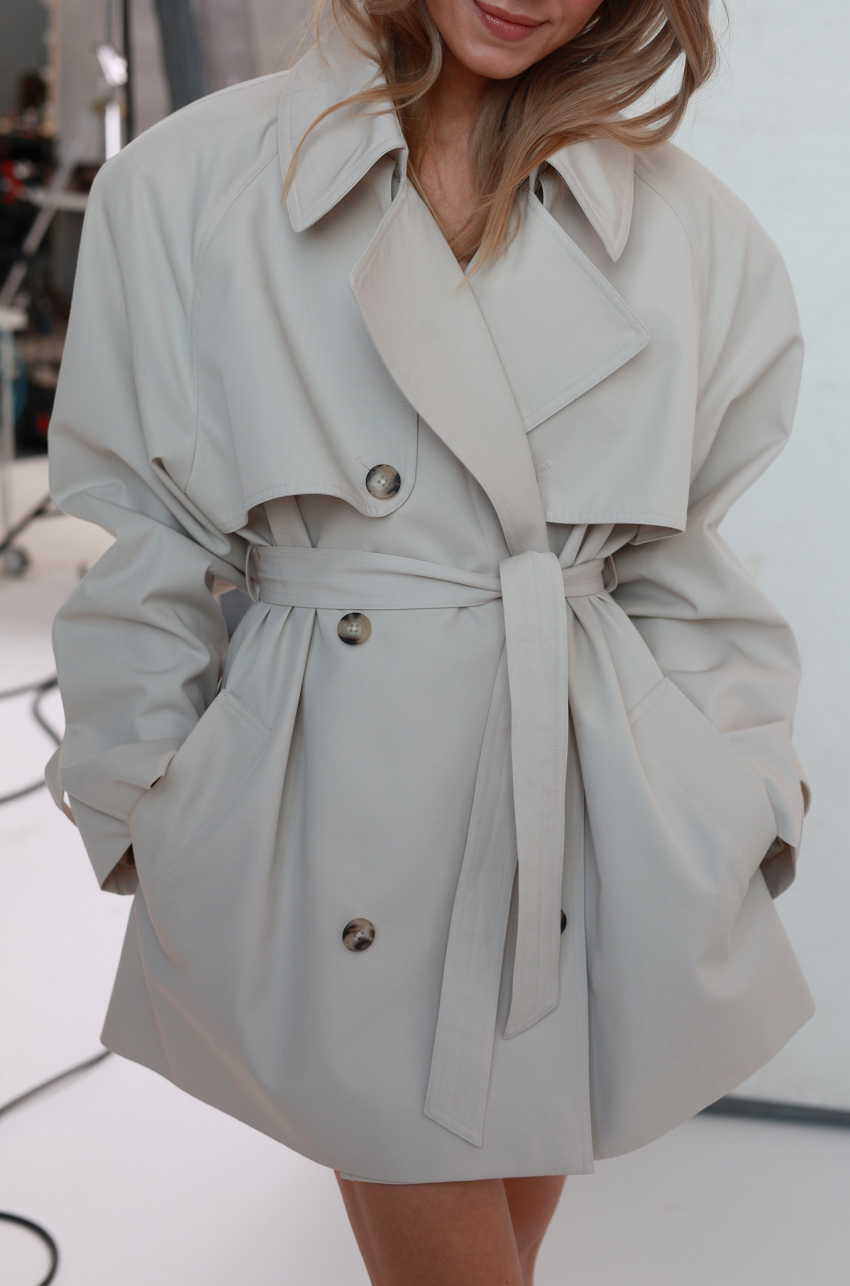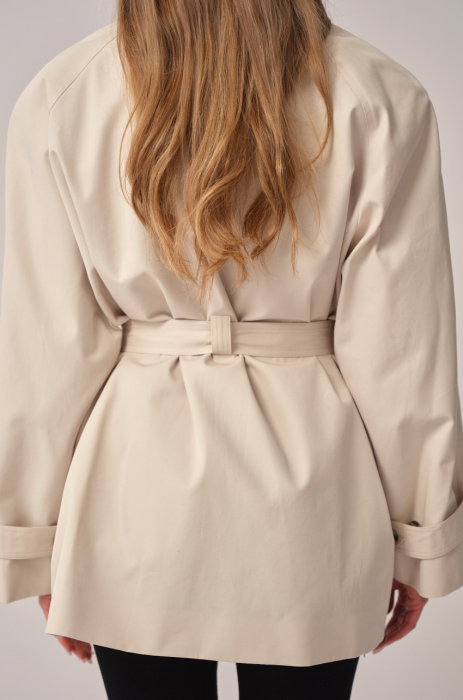 Krótki trencz wykonany z wysokiej jakości bawełny o zwartej, wyraźnej strukturze. Model o swobodnym fasonie z obniżoną linią ramion, zapinany na dwurzędowe guziki. Wyposażony w szeroki kołnierz, patkę na przodzie oraz pasek z tej samej tkaniny do wiązania w talii. Długość za biodra, rękawy o prostej formie. Kolor kamienny.